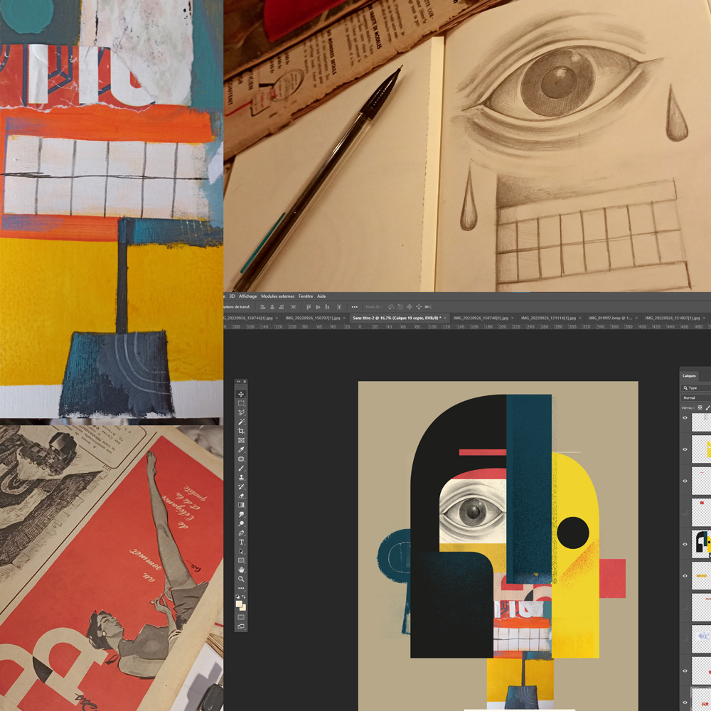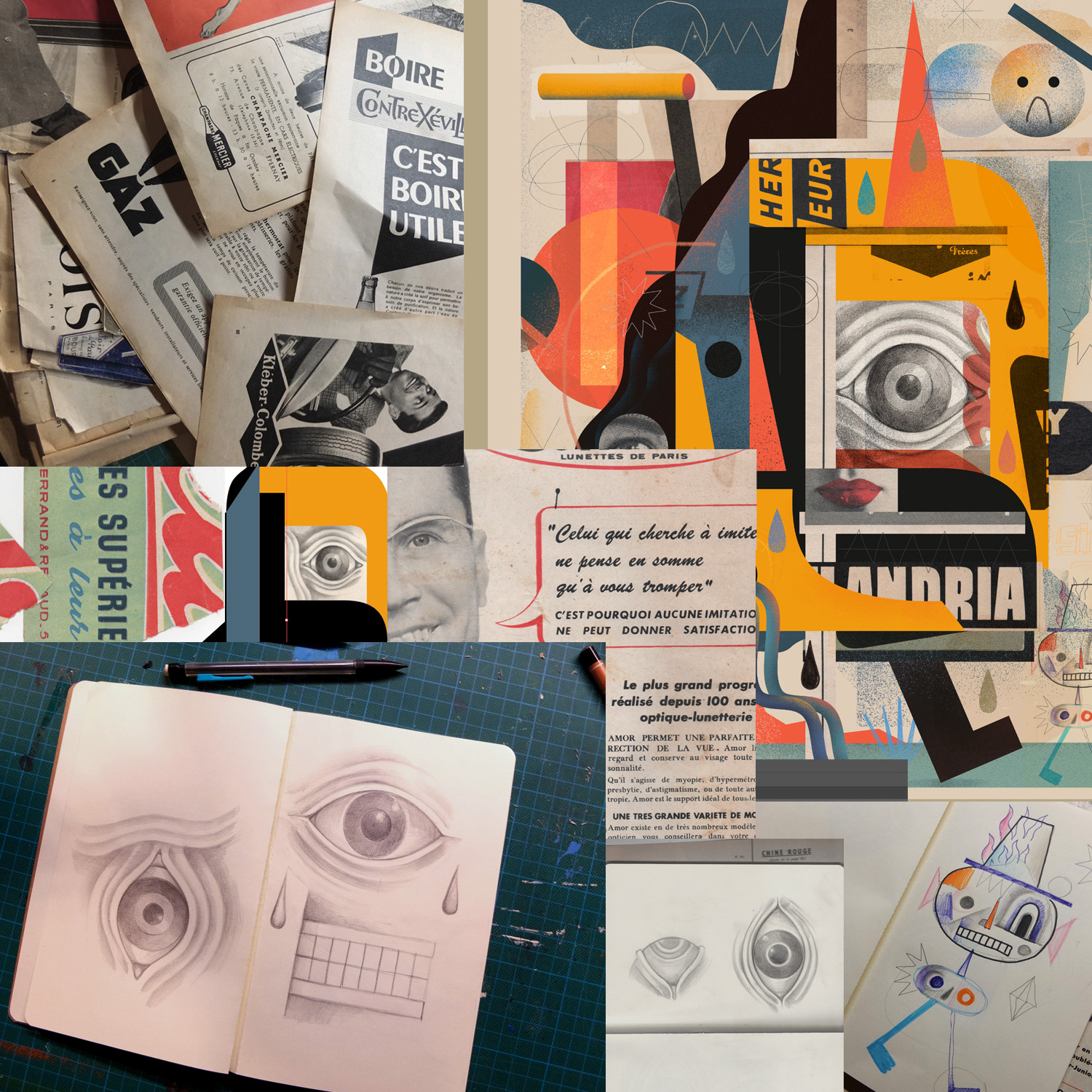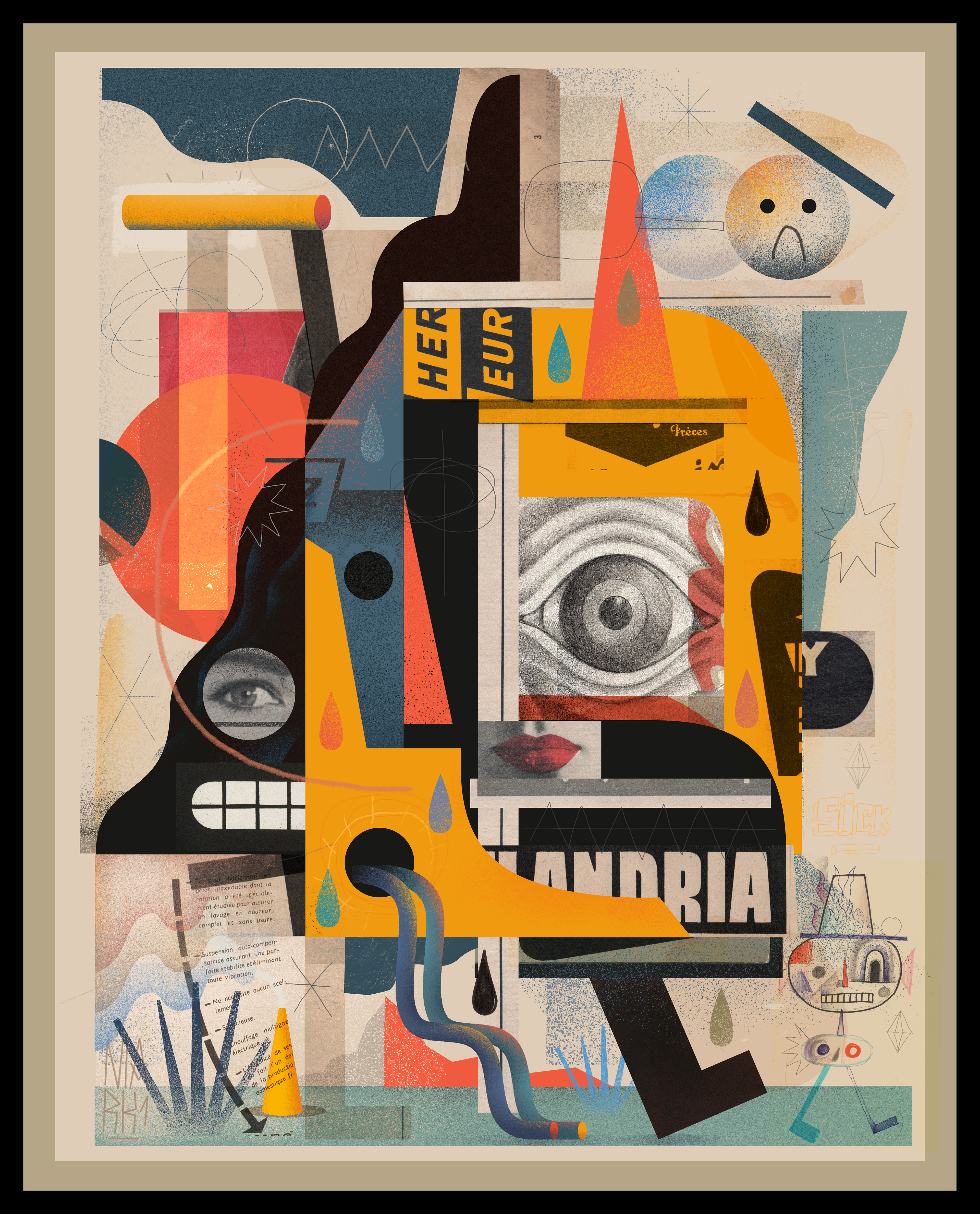 ' Weird Abstract Portraits' is a series of improvised digital collages made with elements of scanned hand drawings and old retro magazine advertisements mixed with digital graphic elements to create an abstract composition of surreal portraits.