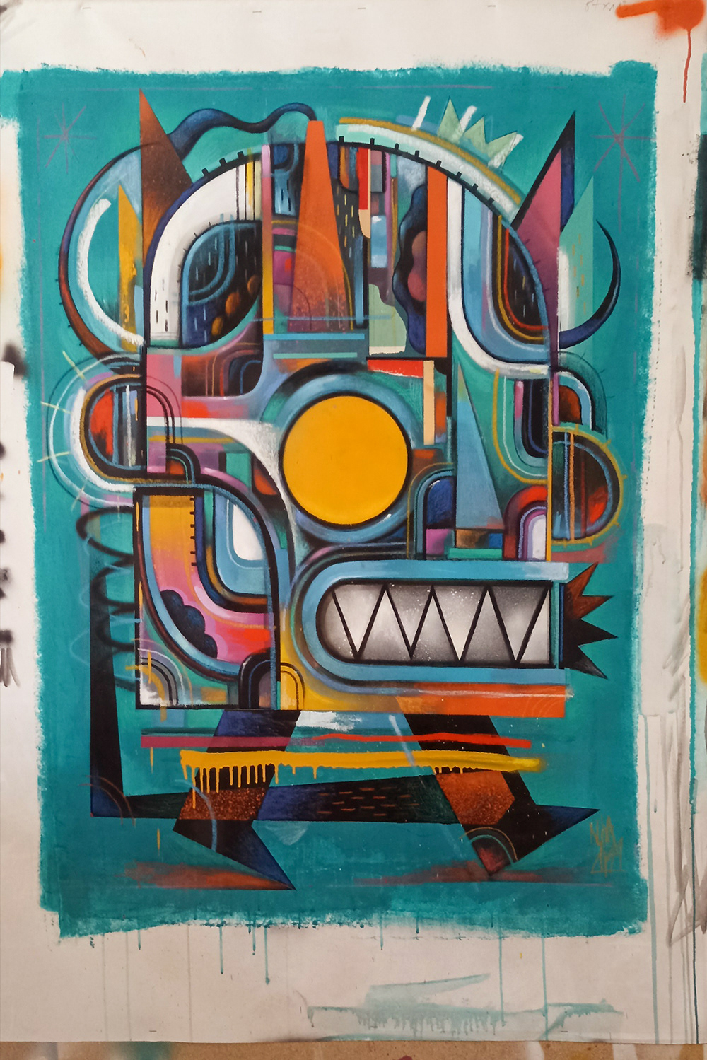 ' PAN ' - Acrylic painting, sprays, oil pencils and collage on 25F ( 81X65 cm) stretched canvas