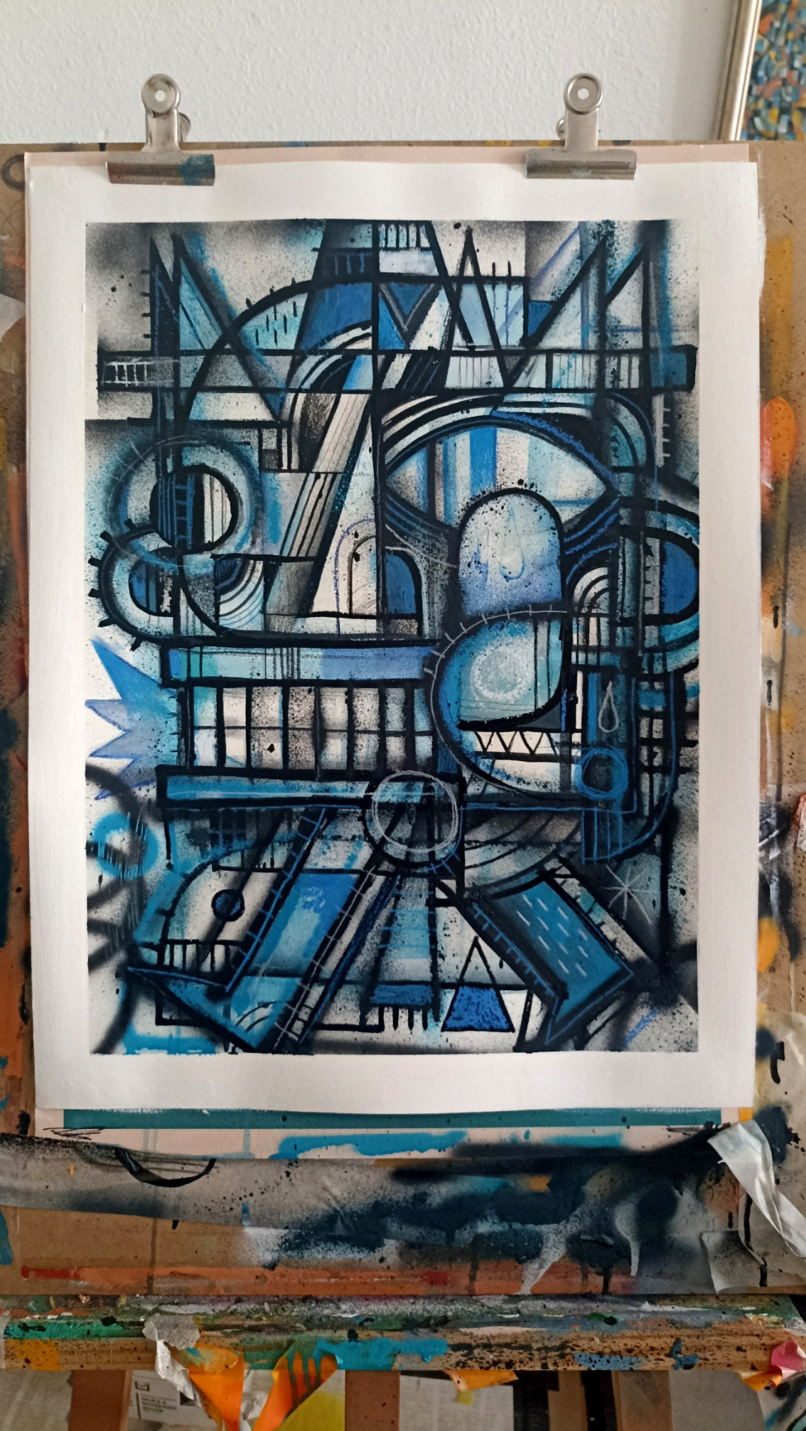 ' Blue Walker ' - Ink, spray, marker & pencils on 320g/m art paper - 50x65 cm